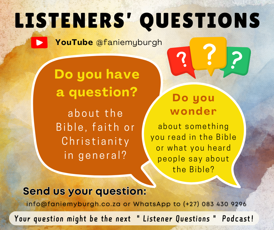 We understand that many people have questions about the Bible, faith, Christianity, or the Christian lifestyle, but may not feel comfortable discussing them with their spiritual leader. Feel free to send us your questions via email or WhatsApp, and we’ll respond or possibly feature your question in our “Listener’s Questions” podcast. When reaching out, please include your details and let us know if you’d like your name mentioned in the podcast or prefer to remain anonymous.